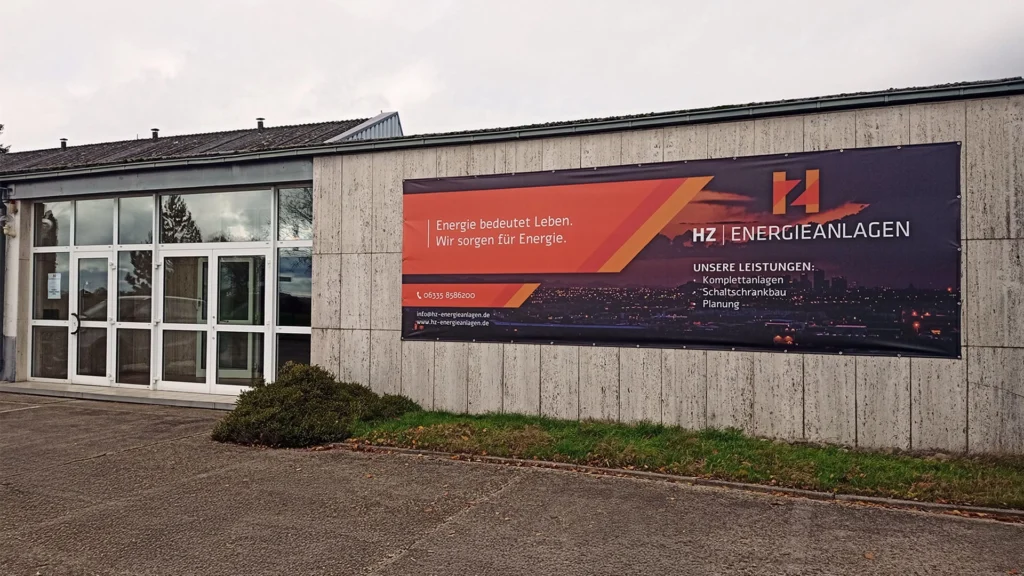 Im Rahmen der Neueröffnung des ersten Deutschen Firmensitzes von HZ-Energieanlagen wurden drei individuell gestaltete Werbebanner für den Innen- und Außenbereich konzipiert und anschließend am Gebäude angebracht. Die Banner zeigen arbeitsbezogene Motive und fügen sich nahtlos in das bestehende Corporate Design von HZ-Energieanlagen ein. Durch die Banner soll die Markenidentität sichtbar gemacht und ein professioneller Gesamteindruck vermittelt werden. Besucher und Mitarbeitende werden so bereits beim Betreten des Geländes visuell angesprochen.